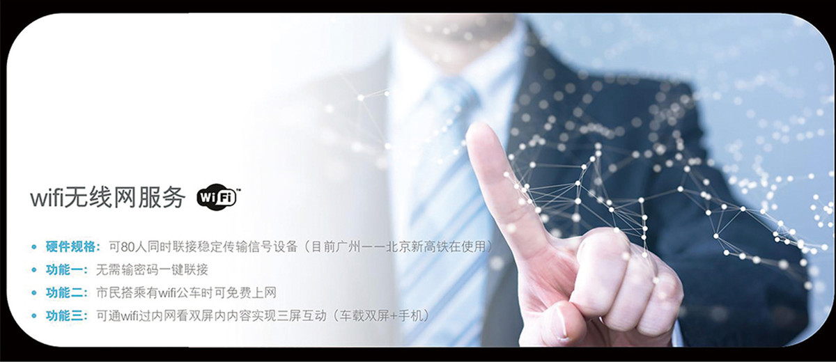 公交WIFI系统——实现无线Wi-Fi热点覆盖和后台软件管理,通过打造平台、提供商户端,让公交乘客成为商户端用户,并在平台上享受安全上网、线上支付、资源搜集、营销广告互动、社交网络、网上购物等一系列功能及服务。